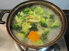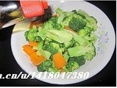锅上水烧开,加盐,滴少许色拉油,放胡萝卜和西兰花,至水再次烧滚,关火,把西兰花、胡萝卜取出沥干水。