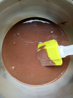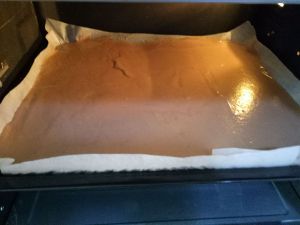 倒入烤盘中,用刮板刮平,轻震几下,振出大气泡,烤箱160度预热6分钟,中层烤20分钟