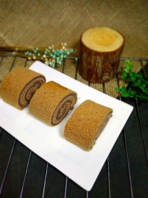 出炉后倒扣在烤网上,撕去油纸,放至温热,重新取一张干净的油纸,把蛋糕放在油纸上卷起,定型15分钟,放凉后切段