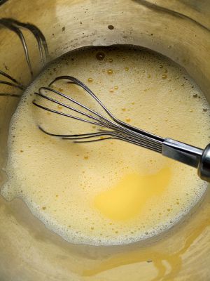 蛋黄中加入牛奶和玉米油搅拌均匀,充分乳化