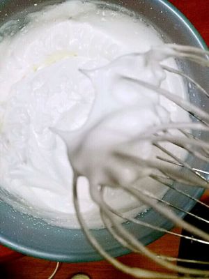 蛋白中加入柠檬汁,用打蛋器低速打出鱼眼泡,加入三分之一的细砂糖,然后继续打发到细腻状态,加入第二次白砂糖,然后继续打发至明显纹路,加入第三次细砂糖,打至提起打蛋器有尖角