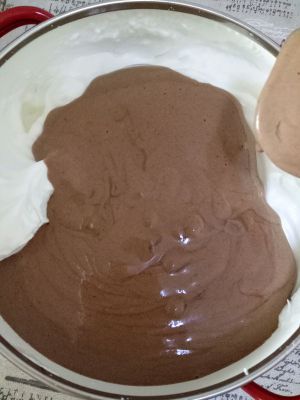取三分之一蛋白加入蛋黄糊中翻拌均匀,然后在倒入蛋白中翻拌均匀
