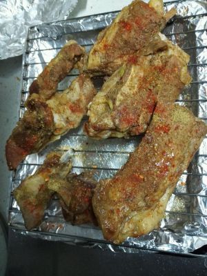 60分钟后,将羊排从烤箱拿出,将烤出来的羊油和汁水倒出,将羊排在烤架上排好,上面洒适量的辣椒面和、孜然粉和盐,再入200℃烤箱烤20分钟,让表面上色,烤出香味。打开烤箱门,香喷喷的烤羊排出炉了,满屋都是幸福的味道。