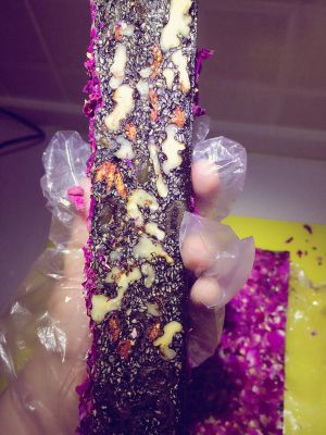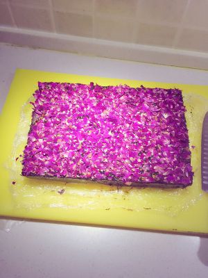 铺上玫瑰花瓣,压实。晾凉了放冰箱保鲜搁一夜。