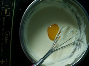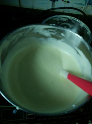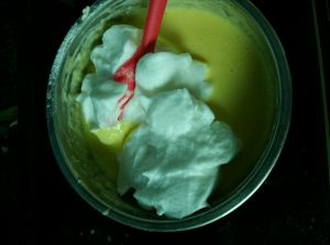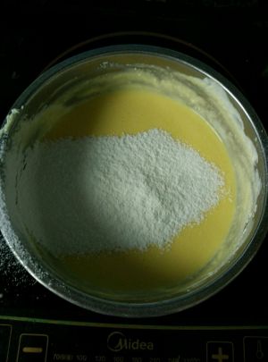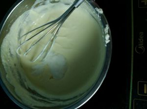 取1/3蛋白放入面糊里,翻拌均匀,不能画圈圈拌