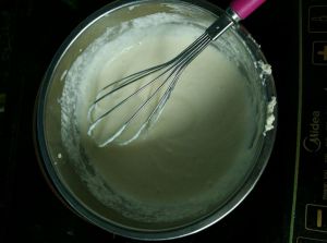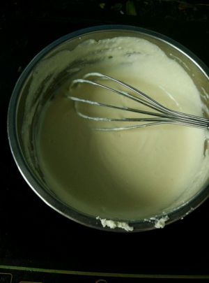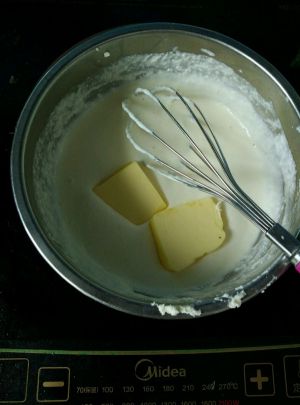 牛奶放入锅里,加入奶酪,最小火加热,边拌成顺滑的状态