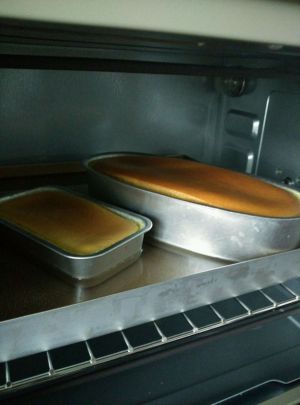 模具底部均油纸,倒入蛋糕糊,震去气泡,放入烤盘里,注入热水