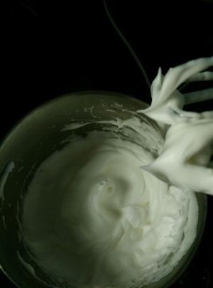 蛋白放入无水无油的盆里,加入糖打至湿性发泡状态