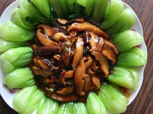 6.最后把炒好的香菇盛在摆好的油菜盘上 大功告成。