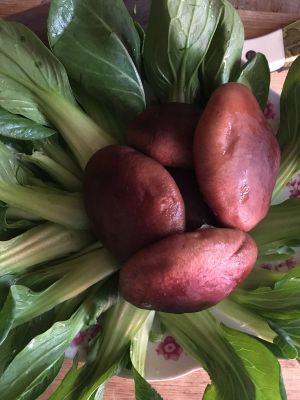 3.把油菜焯下水,(水中放些油和盐会让油菜看起来碧绿有光泽)焯好后把油菜摆盘