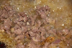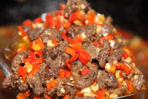 国内倒入500g左右的油,烧到8成热,放入盐渍的牛肉,开始炸,炸至牛肉水分蒸发,表面微微变黑。放入准备好的所有配件,加入2勺豆瓣酱。