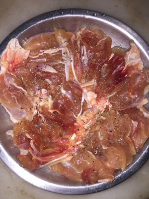 鸡腿用厨房纸吸干水分,用盐和黑胡椒粉盐。如果腌1晚上,盐4克左右,如果只腌2小时左右,盐量相对要多些。