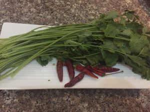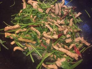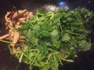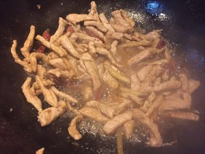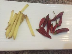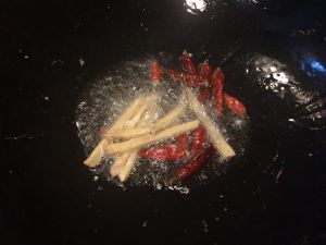 热锅冷油,油热加入姜丝,干辣椒炒香