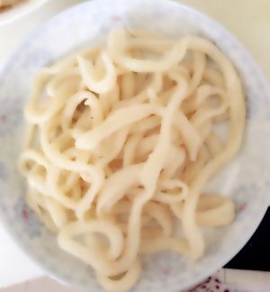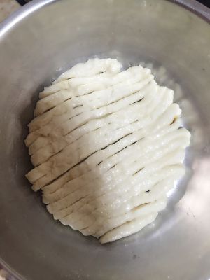 高筋面粉加水和成面团,压成面饼,容器底部涮上玉米油,把面饼切成条状码放在里面,表面也刷上玉米油,然后盖上盖子醒至少两个小时。(我比较懒,所以我是直接用手压成饼的,然后拿水果刀划成条状的),而且面粉要和的软一些,硬了拉不起来