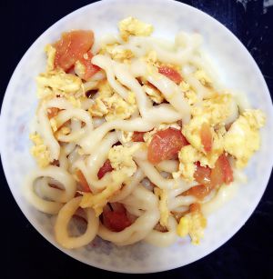 浇上炒好的西红柿鸡蛋就好了(这是女儿吃的,老公吃的我又给他放了肥牛,就是吃火锅的片状的,忘了拍照了)。还可以用芹菜羊肉,牛肉,洋葱牛肉等,不过一般都要放点西红柿或番茄酱。