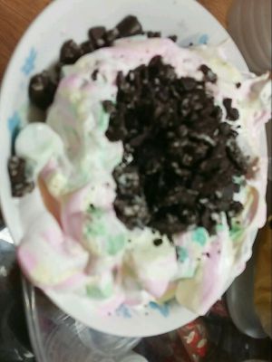 将奥利奥和果干碎加入棉花糖里,快速搅拌