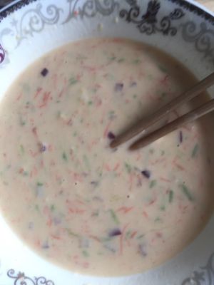 把面粉、鸡蛋放到大碗里加入清水,用筷子搅拌,(就像打鸡蛋一样)然后放入准备好的菜丝,继续搅拌成糊状,放入适量盐和黑胡椒粉。