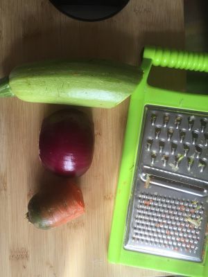 将西葫芦和胡萝卜分别擦丝,洋葱切小丁~