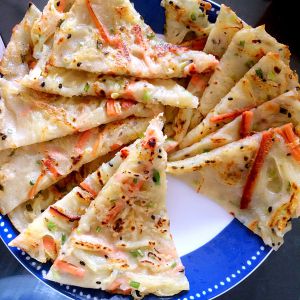 平底锅刷油,把面糊均匀摊在平底锅上,两面煎至金黄