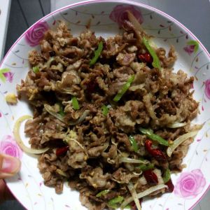 放入圆葱蒜,辣椒。出香味后放入羊肉。盐。味精。料酒。翻炒,肉很快会熟,然后放孜然,出锅。