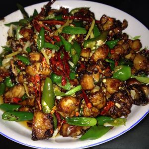 用底油加热先放入姜丝和蒜葱煸出香味,再放干辣椒,炒几下再放青椒,再炒,炒到看着差不多了就把鸡块倒进去再翻炒,炒好后加点鸡精出锅