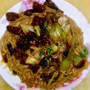 将羊肉串放入,倒入煮熟并过完凉水的面条快速翻炒,加入一点点香油,孜然,盐、味精出锅