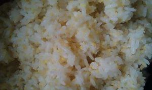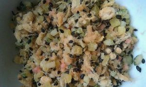 肉松,黑芝麻,黄瓜碎,胡萝卜碎沙拉酱拌匀,加入一半米饭
