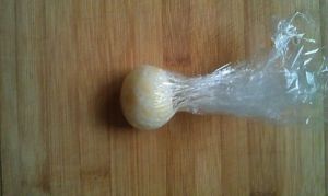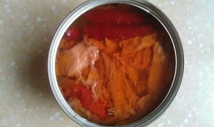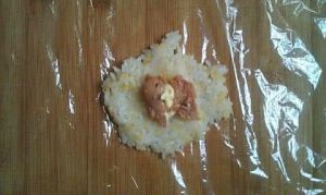 保鲜膜上放一勺米饭压扁,挤一些沙拉酱,放两块金枪鱼