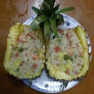 将翻炒出来的米饭放进挖好的菠萝里。放在盘子里上桌。