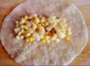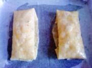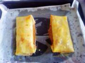 6、取一张面皮,表面刷成油,放入适量馅料,包裹成派坯;
