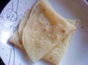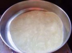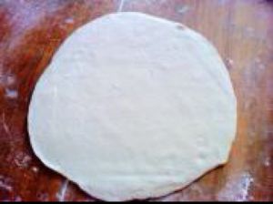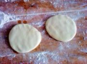 2、撒少许面粉,扣在另一份上,擀成圆形的薄饼;