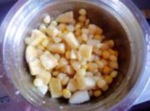 5、香蕉切小丁,加入玉米粒及少许油拌匀;