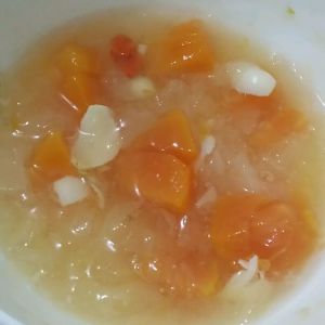 放银耳和水入炖锅,大火烧开,转小火炖,大概半个小时,放入百合和枸杞和冰糖,继续炖一个小时(依个人喜好,我觉得银耳炖成粘稠状最好)