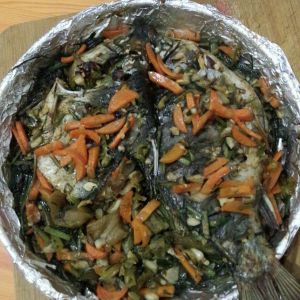 最后将汤汁倒掉,撒上点胡萝卜,进烤箱再烤10分钟;就可以吃了,酸辣味,鱼肉鲜嫩