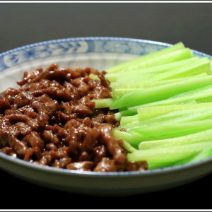 将黄瓜打皮,切粗丝,与刚才的肉丝拼装成一盘。