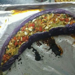 茄子出烤箱后用筷子把那切开的口子撑开,把我们刚调制好的酱料填进去,这个图是刚填上去的。填好后发现还有点汁,我就把它倒进烤盘里了。再进烤箱200度,十分钟