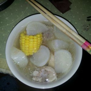 等到40分钟或1小时的时候,打开电饭煲,丢入早就切好的白萝卜块和玉米块。注意:白萝卜切滚刀块,玉米剁成四段差不多
