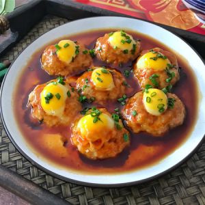 同样的方法把肉丸全部挖好洞,在洞里打入一个鹌鹑蛋。