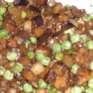 炒锅放植物油,油温热时放入茄丁翻炒至没有水分发蔫时,放入肉丁,葱花和豌豆翻炒。