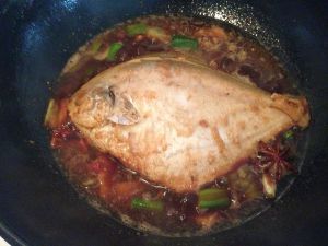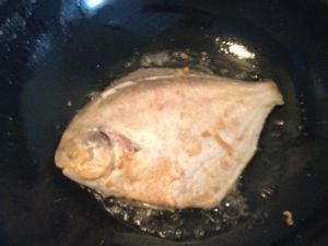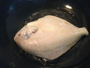 炒锅加热后放油,鲳鱼粘一层鸡蛋液,六成热放入鲳鱼。