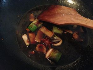将多余的油捞出,锅中留少许底油,依次放入大料、葱、姜、蒜爆香,建议姜和蒜略多一些,然后依次加入一大勺高汤、适量红烧酱油、料酒、米醋和糖,大火烧开。