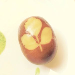 鸡蛋煮熟剥壳,将洗净的菜叶贴放在鸡蛋上,用纱布裹紧扎牢。