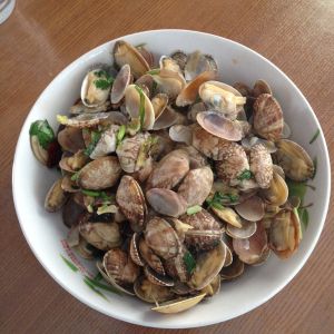 待花蛤皮都张开 再炒一分钟左右 出锅前放入香菜即可 装盘~