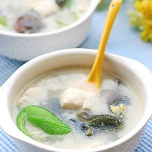 然后下入皮蛋、豆腐,加热至沸腾时转小火,再煮2分钟左右,加少量鸡精、胡椒粉调味,搅拌均匀即可关火。