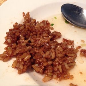 倒入海鲜酱油,老抽,白糖,继续翻炒,按压至上色均匀。我在这之后加入了昨天剩的蒸的广式腊肠,如果没有蒸过要在炒饭之前炒一下