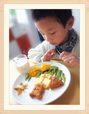 取一点南瓜泥和牛奶搅拌均匀做南瓜牛奶。刀豆炒好、芒果切好、鸡蛋糕切一片,摆盘。
