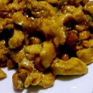 锅里放油,油热后放花椒,葱。放鸡肉,炒到鸡肉发白,倒酱汁,翻炒到收汁,放花生米。起锅,装盘。