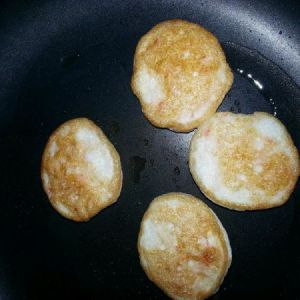 平底锅放少许油 不要放多 开火油不要太热时 用平时吃饭的大点的勺子 沾点油 这样不粘 挖一勺打发好的虾泥 放锅里小火煎 不要反面 火要小 盖上锅盖3分钟 就好了