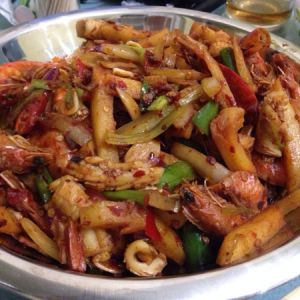 最后放入已炸好的土豆条、青椒、白糖提鲜,出锅。