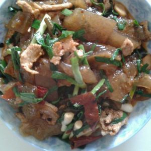 炒一会儿,再依次放入蒜苗,粉皮。记得要翻菜,不然粉皮容易沾锅。起锅前,放少许的盐和鸡精(豆瓣和豆豉都有盐)